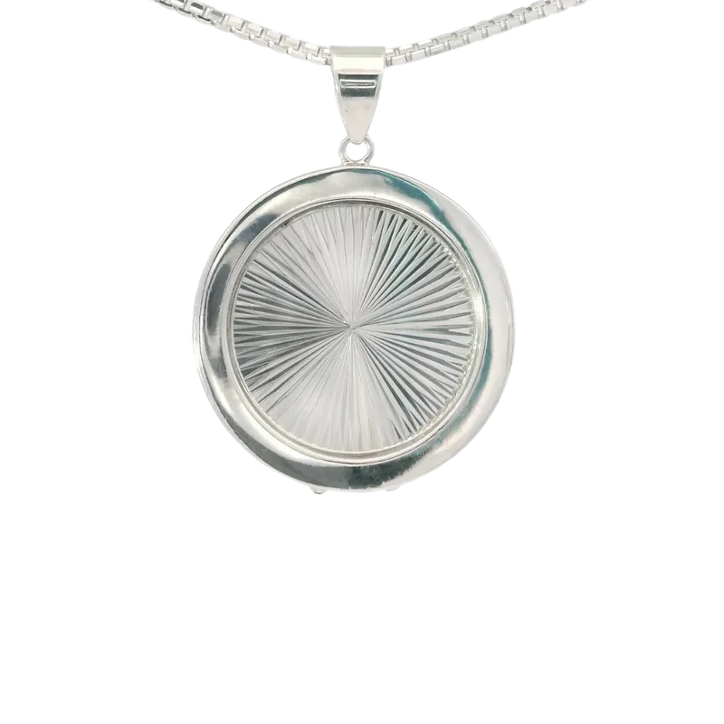 Liontin Emas Juno berbentuk bundar dengan desain yang sederhana namun elegan. Bagian tengah liontin menampilkan pola garis yang menyebar secara simetris menyerupai sinar matahari, memberikan kesan berkilau dan dinamis. Bingkai liontin dari white gold terlihat mengkilap, menambah nuansa mewah.