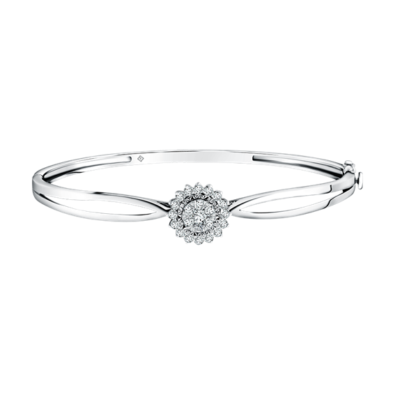 Gelang model bangle dalam koleksi ini dihiasi dengan berlian H VS, ditempatkan dengan cermat dalam bright cut setting dan setting ilusi yang memperbesar serta memperindah kilauannya.