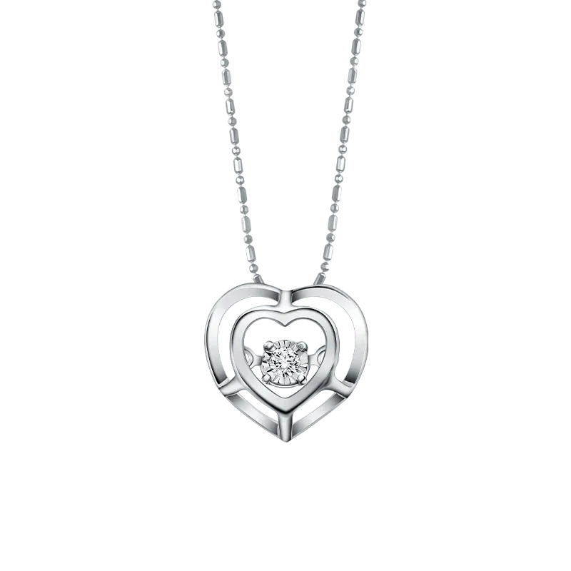 Liontin berbentuk hati menjadi simbol nuansa romantis. Ungkapan hati yang selalu melihat keindahan dalam setiap momen kehidupan. Kalung emas putih dengan liontin dengan desain berbentuk hati dan berhiaskan berlian, menampilkan kesan simpel tapi bermakna dan cocok dikenakan di setiap occasion.