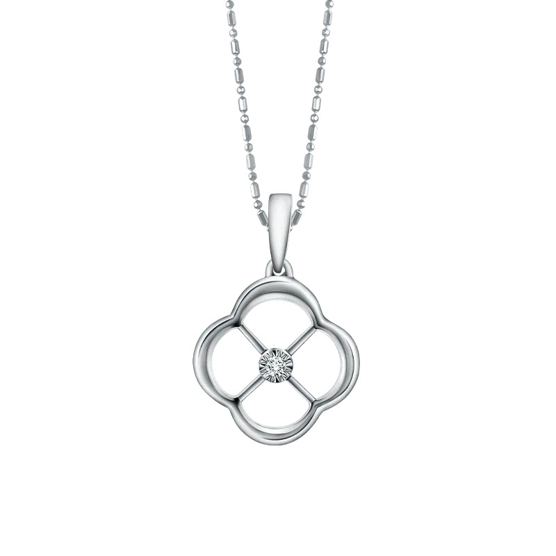 Anda juga bisa memilih model liontin MOELA Intro Kros yang berbentuk sangat unik. Liontin emas putih ini hadir dengan desain menyerupai daun semanggi 4 kelopak yang menjadi lambang keberuntungan. Di bagian tengah-tengah tersematkan berlian round cut kecil yang memancarkan kemilau elegan yang subtle. Liontin cantik ini bisa menjadi hadiah yang sempurna untuk merayakan momen spesial orang tersayang sebagai bentuk doa pengiring untuk keselamatan dan kesuksesannya.