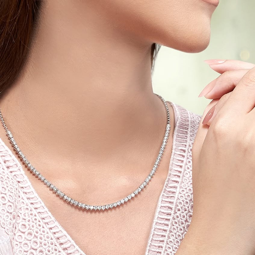 Tennis necklace adalah model kalung yang dihiasi dengan tatahan berlian berukuran kecil yang ditata secara rapi di sepanjang rantai kalung tersebut. Walaupun berukuran kecil, hiasan deretan berlian tersebut memancarkan kilauan mewah yang membuat kalung ini menjadi pilihan sempurna untuk memberikan sentuhan glam pada gaun pesta formal Anda.