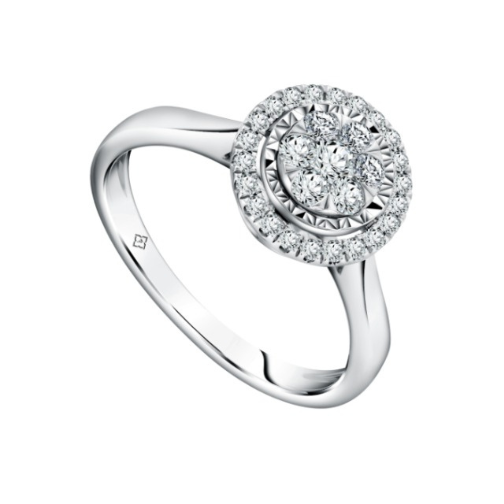 Ada pula cincin yang bertatahkan berlian, hadir dengan nuansa white gold dan desain tatahan berlian H VS di tengahnya berikut ini. Sempurna melengkapi penampilan setiap saat.