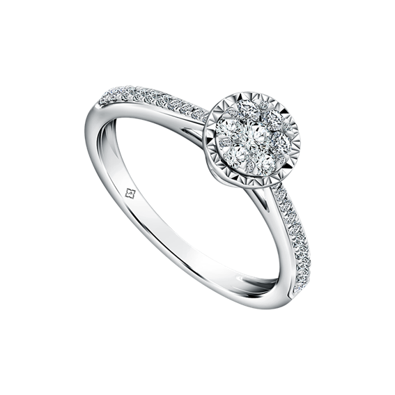 Ada cincin bernuansa white gold dengan desain tatahan berlian H VS di tengahnya berikut ini. Sempurna melengkapi penampilan setiap saat.