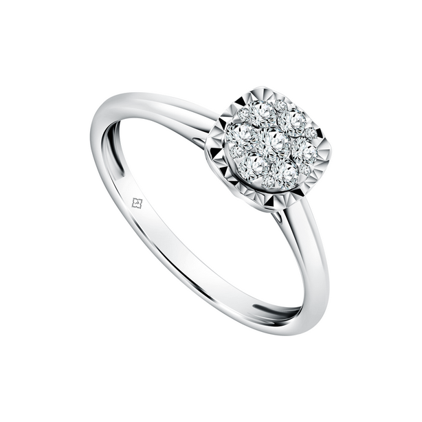 Koleksi Perhiasan Berlian Ilusi Bentuk Cushion The Palace Jeweler menampilkan rangkaian perhiasan, salah satunya cincin berhiaskan diamond berbentuk cushion. Teknik bright cutting pada berlian menciptakan pantulan cahaya yang lebih tajam dan lebih bersinar.