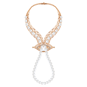Adapun kalung emas berhiaskan berlian lainnya masih dalam seri Nusa, yakni kalung dengan desain unik khas Nusantara. Masih dengan siluet Pending sebagai ornamen utamanya, kalung ini tampil menonjol dengan butiran mutiara yang mengelilingi sisi kalung, hingga menjuntai ke bagian bawah. Kalung ini cocok dijadikan statement piece untuk memaksimalkan penampilan. Desain Kalung Emas dengan Mutiara dari Koleksi Nusantara