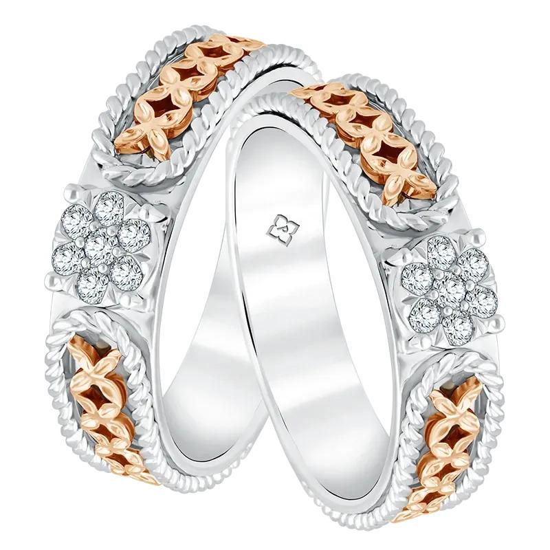 Cincin ini tidak hanya mengusung desain wedding ring minimalis bernuansa modern. Sentuhan two-tone yang memadukan warna rose gold dan emas putih pada cincin ini semakin memberikan sentuhan yang elegan. Desainnya yang simple juga sangat digemari dapat dipadupadankan dengan berbagai busana saat pernikahan maupun untuk daily wear.
