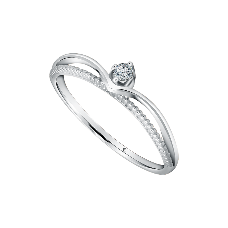 Cincin emas putih ini hadir dengan desain unik menyerupai mahkota dengan tatahan berlian tunggal yang dipadukan dengan ornamen perle atau bola-bola emas kecil yang tersusun sangat rapi dan memberikan kesan unik.