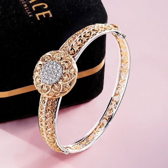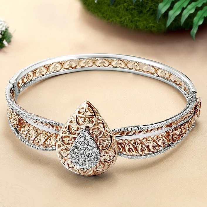 Terlihat detail yang indah dan romantis dari perhiasan emas dengan berlian ini, menampilkan kemewahan dengan nuansa tradisional berpadu modern. Salah satu andalannya adalah perhiasan gelang, lihat rekomendasinya berikut ini.