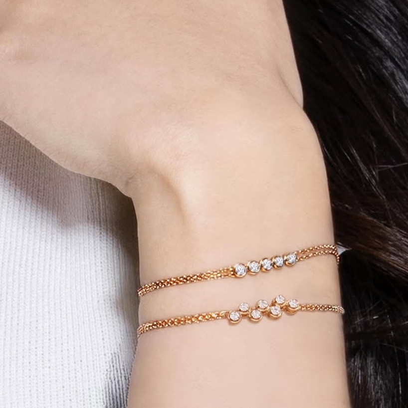 Salah satu highlight-nya adalah gelang tangan emas dengan berlian berdesain bubbles yang simpel namun stylish, memadukan kesan modern, lembut, dan playful khas Korea. Dihiasi dengan berlian H VS berstandar tinggi, koleksi ini menawarkan sentuhan mewah tanpa kehilangan nuansa minimalis yang sedang tren.