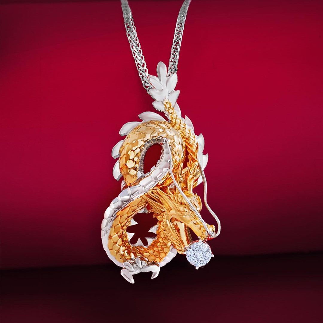 Perhiasan kalung emas putih pria ini memiliki liontin berbentuk naga emas yang memancarkan aura maskulin. Tatahan berlian yang bertenger di ujung moncong sang Naga membuat liontin kalung ini terlihat semakin mewah. Di dalam beberapa kebudayaan, naga memiliki makna yang berkaitan dengan keperkasaan, kemakmuran, dan keberuntungan.