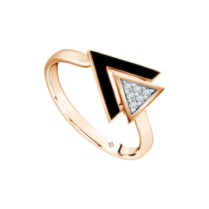 Opsi cincin lainnya yang membuat pasangan Anda terkesan adalah cincin dengan elemen berbentuk segitiga berikut yang dipercantik dengan enamel hitam.