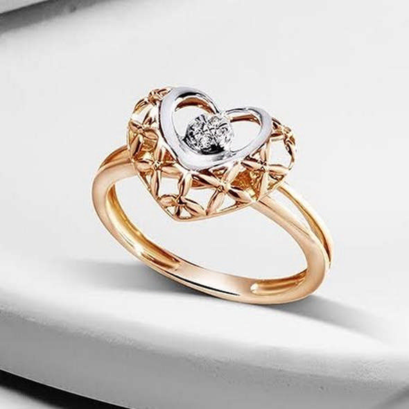 Cincin emas dua warna ini memadukan emas kuning dan emas putih, berhiaskan berlian yang berkilau. Desainnya yang berbentuk hati begitu manis, membuat siapa pun terpikat melihatnya.