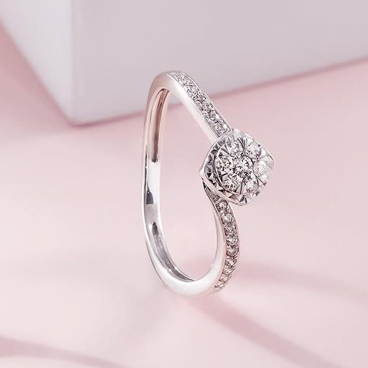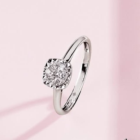 Cincin berlian memang menjadi salah satu pilihan klasik untuk digunakan sebagai cincin lamaran. Apalagi, dengan material emas putih yang menjadi bahan dasar cincin yang semakin memaksimalkan kilauan alami berlian tersebut. The Palace Jeweler juga hadir dengan model cincin emas berlian dengan desain cluster cushion yang menampilkan pesona berlian berbagai ukuran yang membuat cincin ini terlihat semakin elegan.