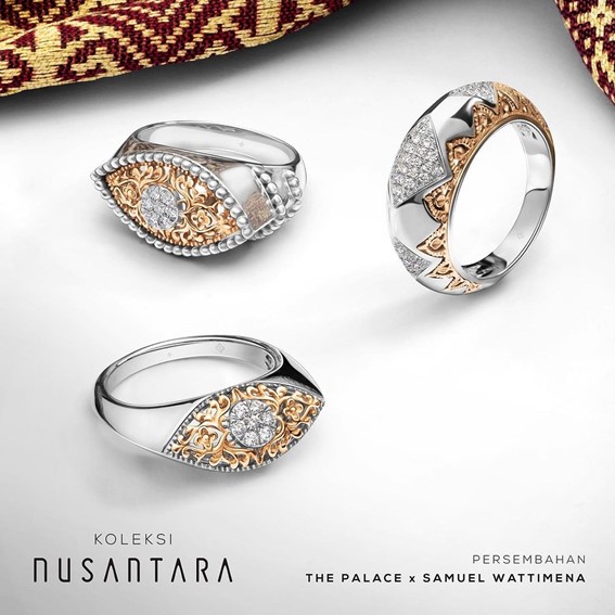 Sebagai gerai perhiasan THERLENGKAP, The Palace Jeweler juga menghadirkan koleksi cincin emas pria berhiaskan berlian yang elegan dan maskulin dalam koleksi Nusantara. Koleksi ini merupakan hasil kolaborasi dengan perancang fashion ternama, Samuel Wattimena.