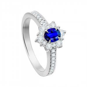 Cincin berlian wanita terbaru ini terbuat dari emas putih 3,2 gram bertatahkan 14 butir berlian 0,4 carat yang didesain menyerupai kelopak bunga. Pada bagian tengah cincin, tersemat blue sapphire 1,5 carat yang teramat cantik.