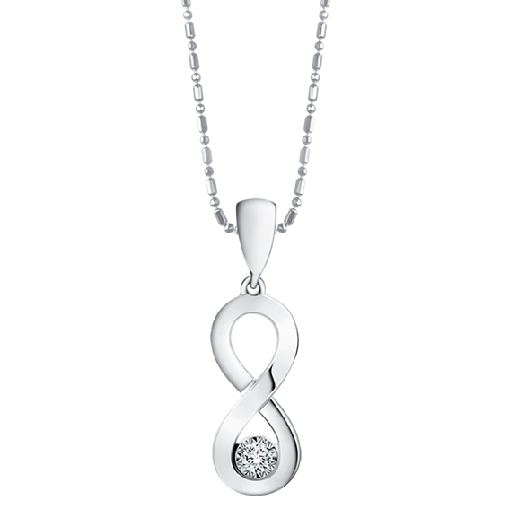 Selain cincin, opsi perhiasan lainnya yang bisa jadi pilihan yakni pendant. Nampak elegan dengan balutan white gold serta lambang infinity yang bertatahkan berlian.