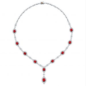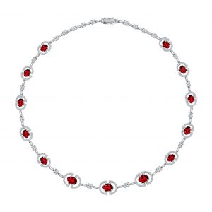 Kalung berlian Flamma yang berhiaskan 10 batu ruby dan bertabur berlian mewah