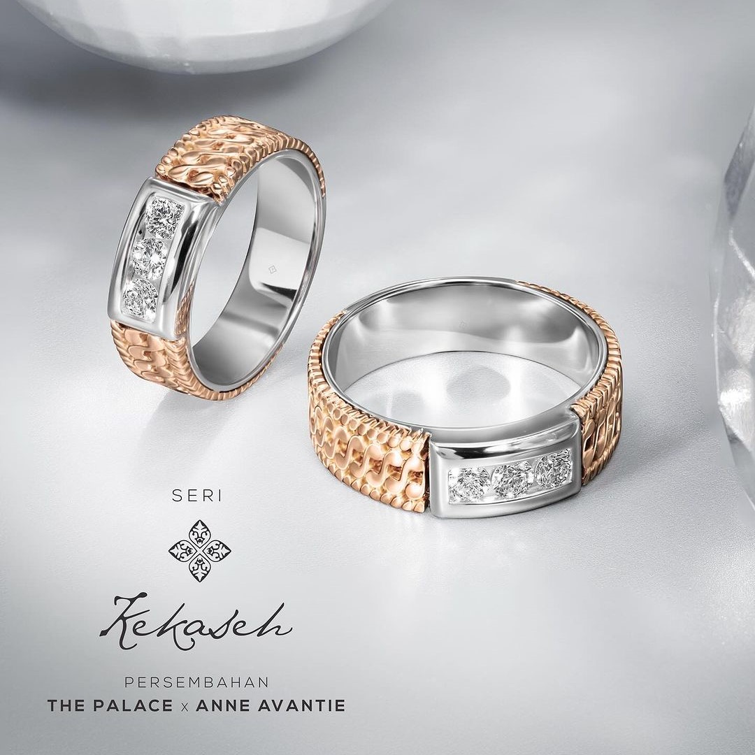 Apabila hendak melanjutkan ke jenjang pernikahan, The Palace Jeweler juga menyediakan ragam desain cincin nikah yang terbaik, salah satunya dari koleksi Kekaseh. Berkolaborasi bersama Anne Avantie, desain cincin kawin dalam koleksi ini terinspirasi motif batik yang dipadukan dengan white gold, yellow gold, dan rose gold, serta dilengkapi sematan berlian dalam tatahannya.