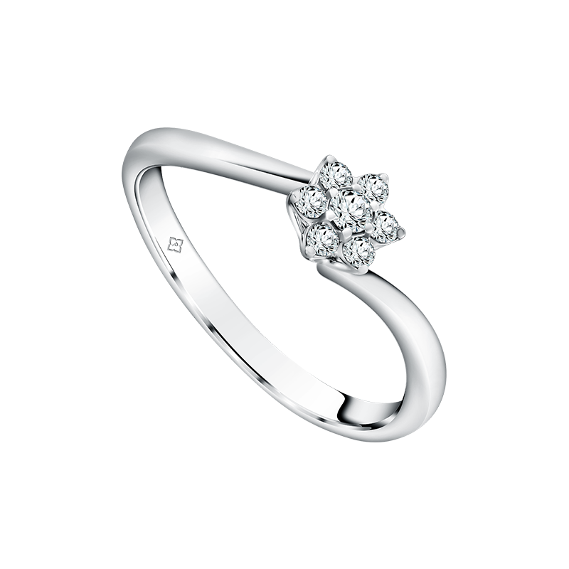 Ada cincin Berlian Ilusi Lekukan Raka Bunga Cilik yang menghadirkan cincin manis dengan detail berlian berbentuk bunga.