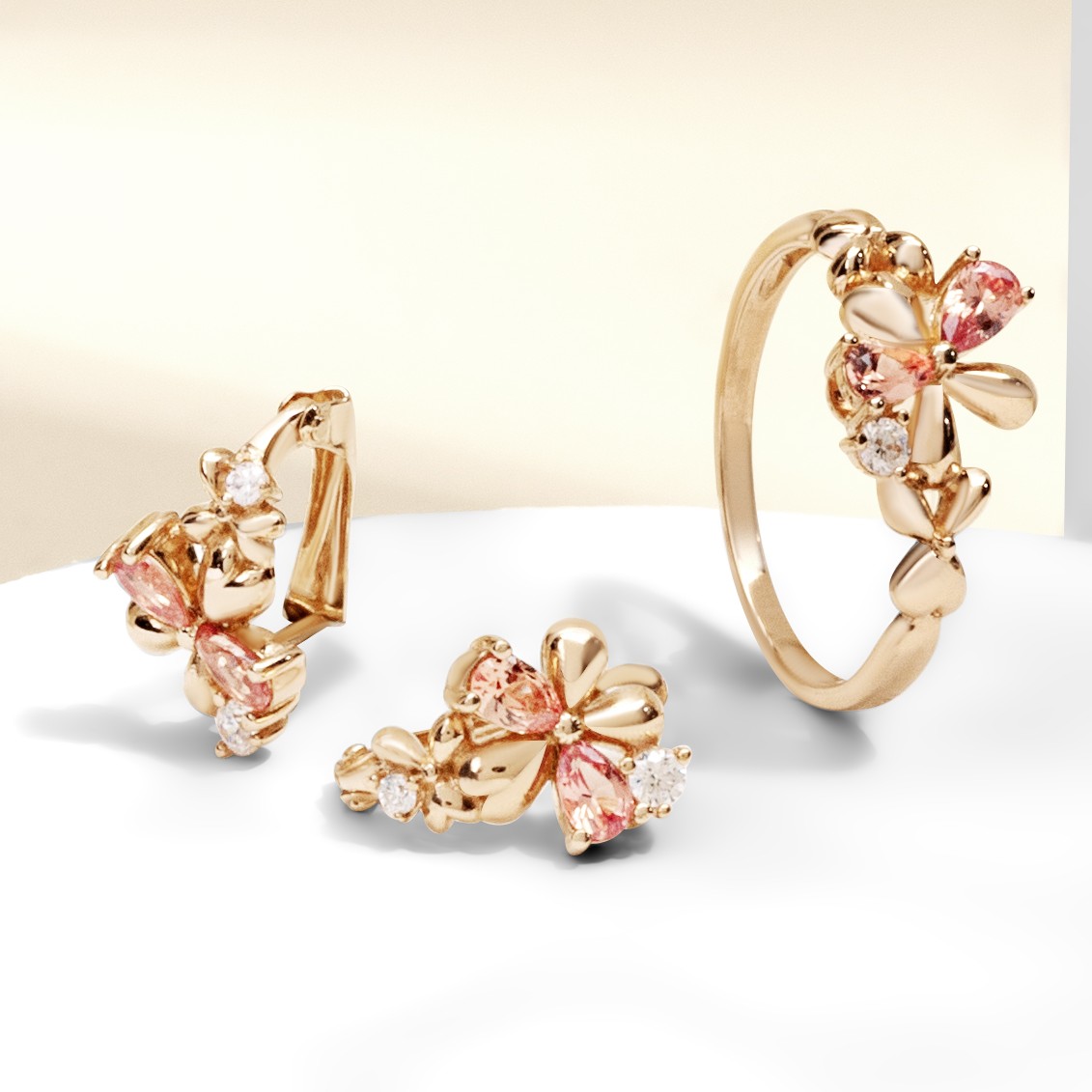 Cincin ini hadir dengan warna rose gold yang elegan dan sehangat matahari senja. Bentuk mata cincin berupa bunga dan dihiasi dengan tatahan berlian berwarna melambangkan passion dalam kehidupan percintaan Anda. Seri perhiasan ini juga hadir dalam bentuk kalung, gelang, dan anting-anting yang sangat cocok dipersembahkan sebagai apresiasi atas pribadi pasangan yang ambisius dan passionate dalam segala hal yang ia lakukan.
