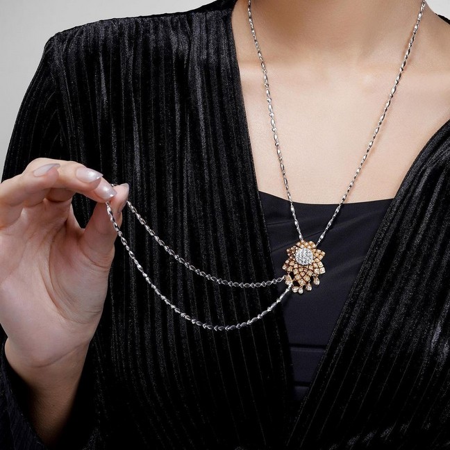 Kalung emas putih yang dihiasi berlian ini dirancang dengan desain unik, terlihat bentuk bersudut di bagian depan saat dikenakan, seperti liontin yang menyatu dengan kalungnya. Perhiasan kalung ini ideal dipadukan dengan outer cardigan.