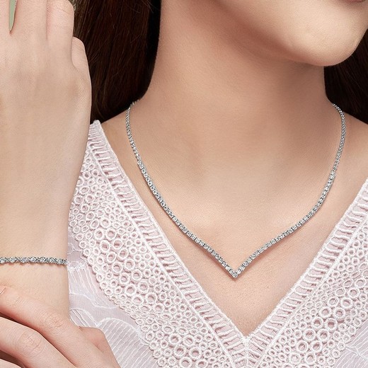 Desain yang modern dan unik menambah daya tarik kalung ini. Anda bisa memadukan outfit lace shirt berkerah v-neck dengan kalung emas putih dan berlian ini, menjadikan kalungnya matched dengan outfit-nya. Siapa pun akan terpesona melihat outfit lace shirt Anda dipadukan dengan kalung berlian tennis.