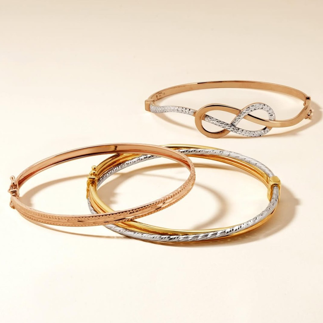 Gelang bangle two-tone dari The Palace ini memiliki beragam desain yang elegan, mulai dari motif infinity berlapis sentuhan white gold, detail ukiran halus, hingga aksen dinamis yang menciptakan kesan unik dan mewah.