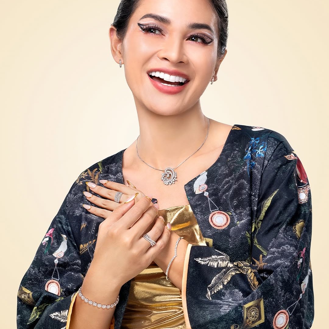 Rosianna tampil sangat memukau dan eye-catching dengan padu-padan gelang emas dari koleksi Nusantara. Koleksi perhiasan ini hadir dengan berbagai desain gelang bermotif tradisional yang unik dan melambangkan keanekaragaman kebudayaan dari berbagai daerah di Indonesia. Nusantara merupakan buah manis dari kolaborasi antara The Palace Jeweler dengan seniman fashion Samuel Wattimena.