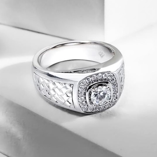 Kemewahan dalam ketenangan terpancar dari cincin bermotif tekstur yang kontemporer, menjadikannya pilihan tepat untuk Anda yang ingin tampil berkelas dan stylish di setiap kesempatan. Koleksi Men's Jewellery ini menghadirkan desain mewah dengan tatahan berlian round-cut di pusat tengah, dikelilingi halo berlian kecil yang memperkuat kesan elegan. Keunikan cincin pria ini terletak pada ukiran bermotif anyaman di permukaan ring band, menciptakan tekstur maskulin yang berpadu sempurna dengan kilau berliannya, sebuah simbol gaya modern yang kuat namun tetap refined.