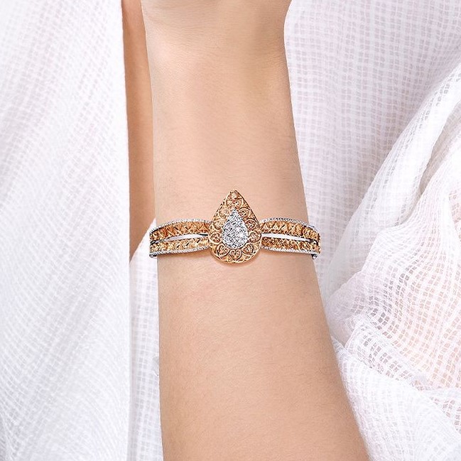Keindahan dari budaya Indonesia terpancar begitu indah dari gelang emas berhiaskan berlian ini. Anda pun dapat tampil memukau di setiap kesempatan.