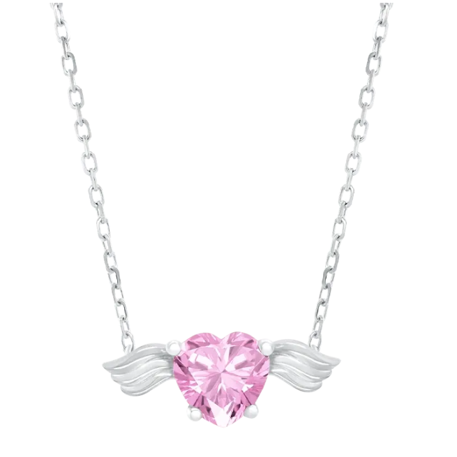 Setiap wanita dijamin akan tersipu bahagia menerima kalung ini. Model kalung emas putih terbaru ini hadir dengan desain liontin berbentuk hati bersayap yang manis. Bertatahkan batu permata sapphire berwarna merah muda, kalung ini melambangkan cinta pertama yang polos dan murni. Sayap pada liontin kalung ini juga menyiratkan simbol bahwa cinta bisa terbang dan berkembang menjadi suatu hal yang sangat indah.