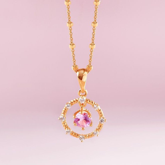 Pada liontin ini, hiasan batu berharga yang berwarna pink menjadi fokus dengan dikelilingi circle berhiaskan butir-butir permata. Ini adalah liontin dengan desain modern yang diberi sentuhan keanggunan dari warna pink, menjadikannya unik dan eye-catching Rp 1 jutaan saja.