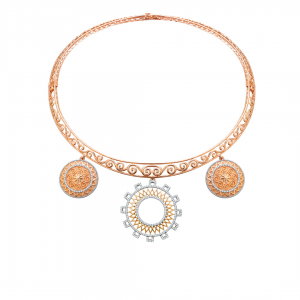 Satu lagi design unique diamond necklace keluaran seri Tara, yakni kalung dengan model collar yang indah nan menawan. Kalung jenis ini cocok dipakai dalam acara resmi dengan mengenakan gaun yang memperlihatkan potongan bahu. Terdapat ukiran di sekeliling collar yang menambah sentuhan etnik dari kalung ini. Menggantung tiga ornamen dengan siluet matahari yang memiliki desain unik, membuat tampilannya semakin stunning dan mewah. Unique Diamond Necklace Collection Seri Tara dari The Palace