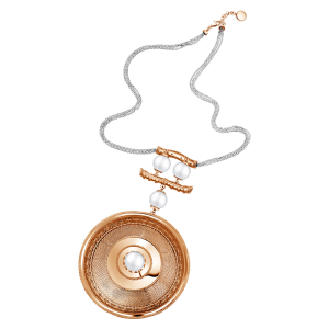 Balutan desain siluet matahari dengan paduan emas dan butiran mutiara juga dapat dilihat pada model unique diamond necklace satu ini. Desainnya sangat unik, dengan rantai yang berpadu dengan pearl membentuk kesatuan yang indah. Ornamen dengan siluet matahari yang bernuansa gold dipermanis dengan sentuhan butir mutiara di bagian tengahnya. Design Unique Diamond Necklace dari The Palace