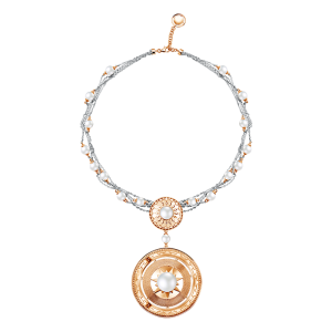 Adapun model unique diamond necklace lainnya dari seri Tara adalah kalung berhiaskan emas dan berlian, membentuk siluet kombinasi tiga perhiasan khas daerah Indonesia Timur. Desainnya begitu unik dan menuai atensi setiap orang yang melihatnya. Dipermanis dengan butiran pearl yang melengkapi tampilan kalung sehingga menonjolkan kesan yang berbeda. Model Unique Diamond Necklace dari The Palace
