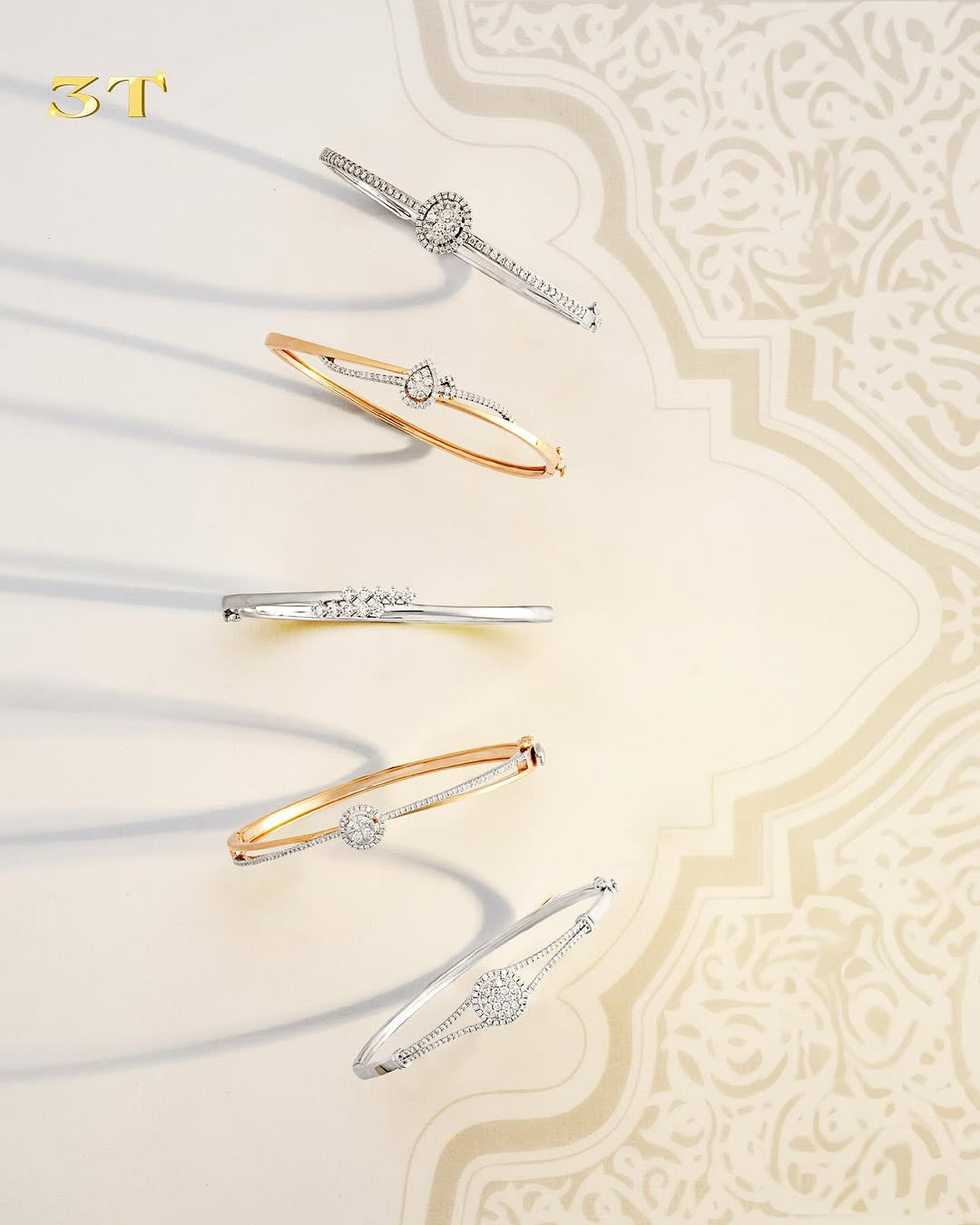 Menampilkan deretan bangle yang sangat cantik, Anda pasti akan kesulitan memilih hanya satu. Kelima model bangle ini hadir dengan desain modern dan lembut, masing-masing dihiasi detail pusat berupa butir-butir berlian berbentuk lingkaran, oval, hingga teardrop. Variasi warna pun menambah daya tarik, mulai dari emas klasik hingga kombinasi dua warna yang menciptakan kesan mewah dan elegan di setiap tampilan.
