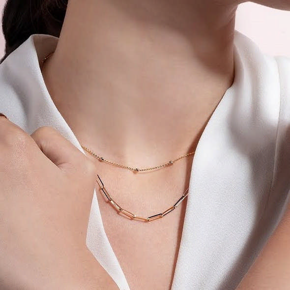 Blouse putih bisa menjadi pilihan outfits yang sempurna untuk menghadiri acara pesta natal bernuansa semi-formal maupun formal. Anda bisa memadukan blouse tersebut dengan rok untuk penampilan yang feminin atau celana panjang stylish untuk kesan modern. Untuk membuat penampilan Anda jadi terlihat lebih festive, padukan blouse putih tersebut dengan model kalung emas simple elegan dari The Palace Jeweler ini.