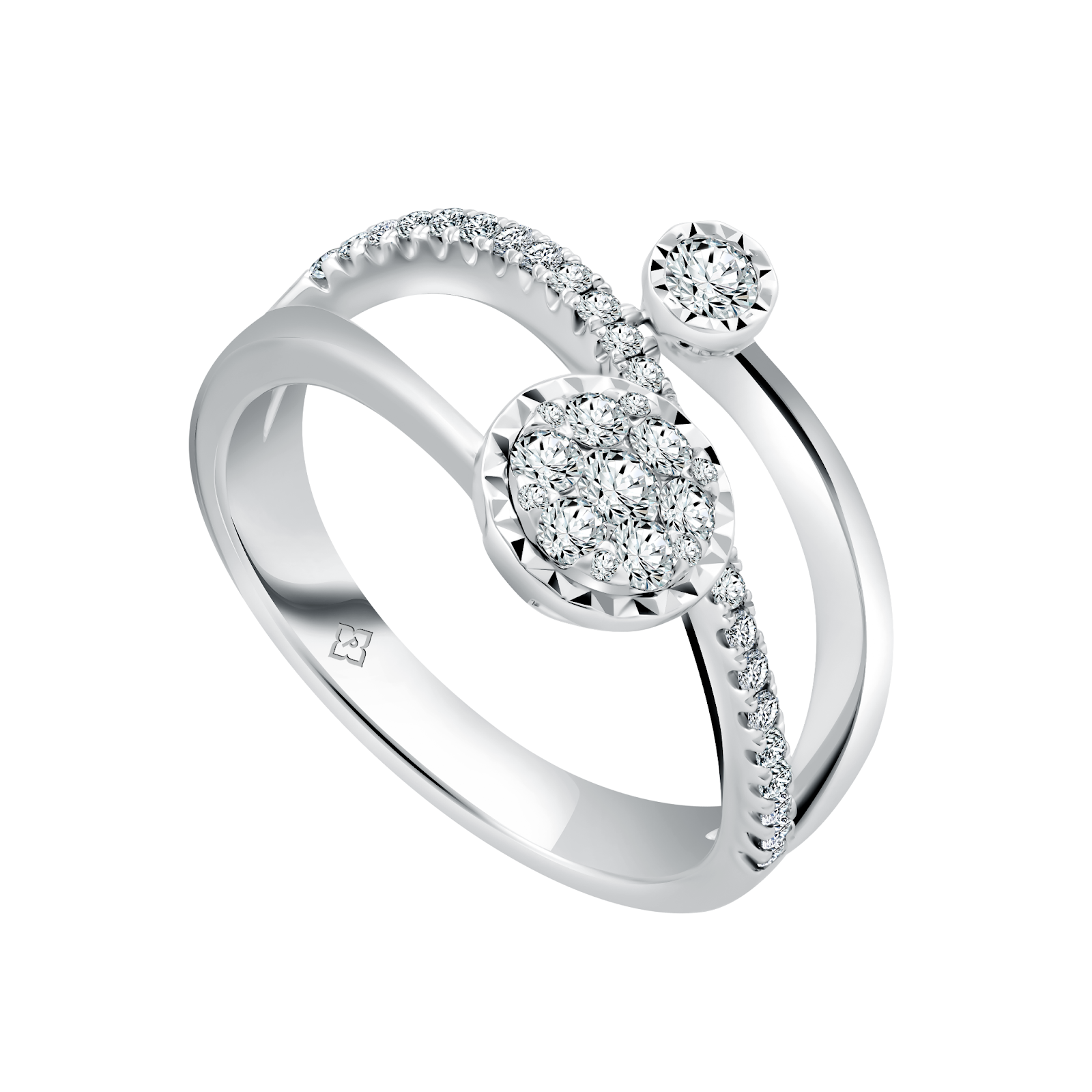 Cincin Berlian Ilusi Simfoni Keabadian menjadi simbol keindahan dan ketahanan sepanjang masa. Kilau berlian H VS dengan setting ilusi ini terlihat begitu jernih dan menawan dalam balutan white gold 18K.