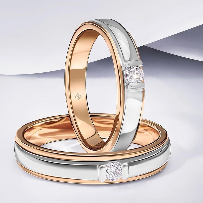 Jika memilih konsep pernikahan modern atau ala Barat, ada berbagai model cincin wedding ring The Palace Jeweler yang cocok dengan gaun pengantin yang umumnya jadi pilihan, seperti ball gown, A-line, mermaid silhouettes dan sebagainya. Misalnya cincin wedding ring dengan kombinasi dua warna ini yang jadi pilihan tepat kalau Anda dan pasangan menginginkan model cincin yang tidak mainstream.